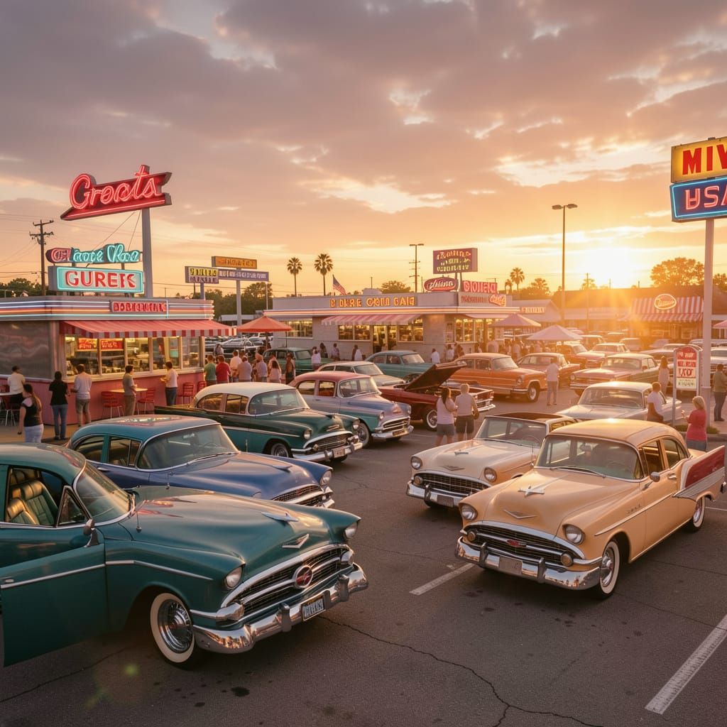 This image captures a nostalgic 1950s drive-in diner at sunset, filled with vintage cars under glowing neon signs. Photorealistic style with a wide-angle view.