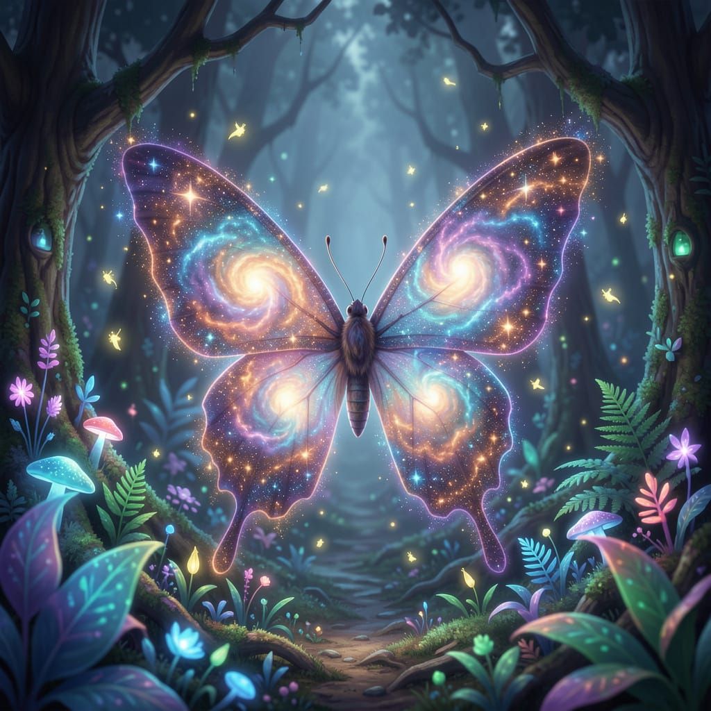 This image shows a glowing butterfly with nebula wings in a dark, enchanted forest. Bioluminescent plants and fireflies create a mystical, ethereal glow in a whimsical digital art style.