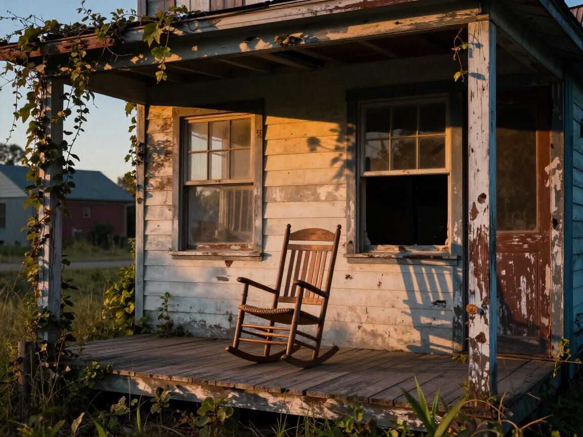 This image shows an empty, weathered rocking chair on the porch of a decaying 1930s service station. The scene evokes nostalgia and mystery, rendered with deep colors and volumetric lighting in a detailed matte painting style.