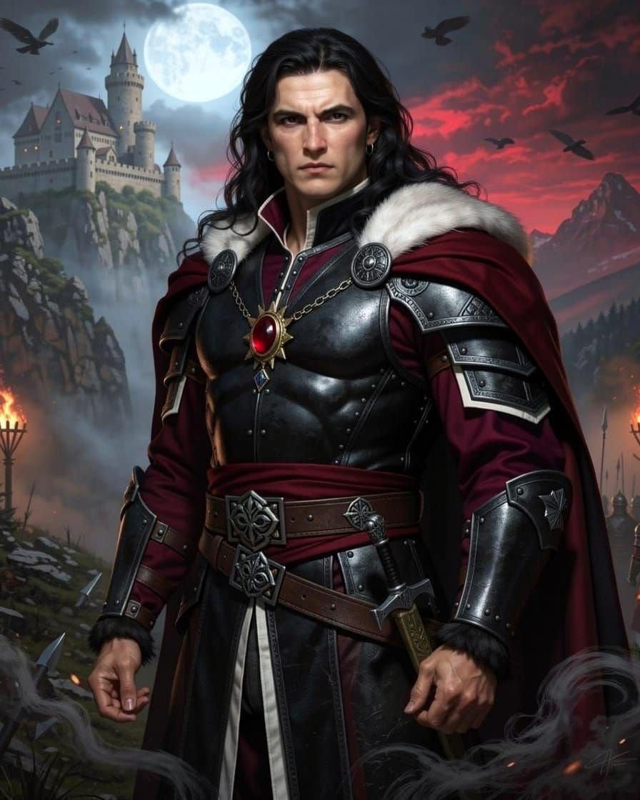 This image shows a Romanian warrior prince in elegant medieval attire, featuring dark fantasy elements and intricate detail. Rendered in a matte painting style with deep colors and complementary hues.