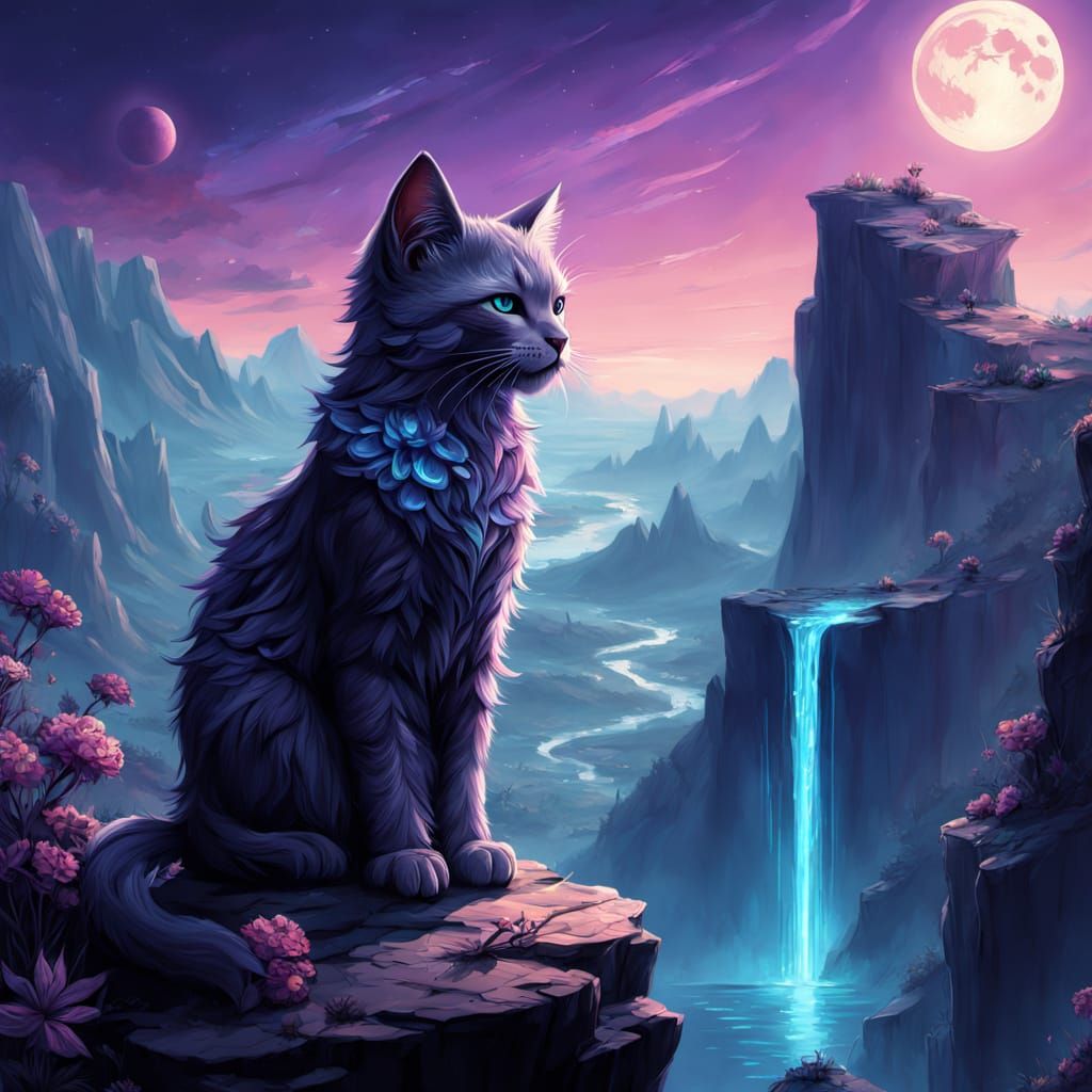 This digital painting shows a small, glowing-furred cat on a jagged cliff, overlooking a lush, bioluminescent landscape under a large moon. The scene features cool, ethereal lighting.