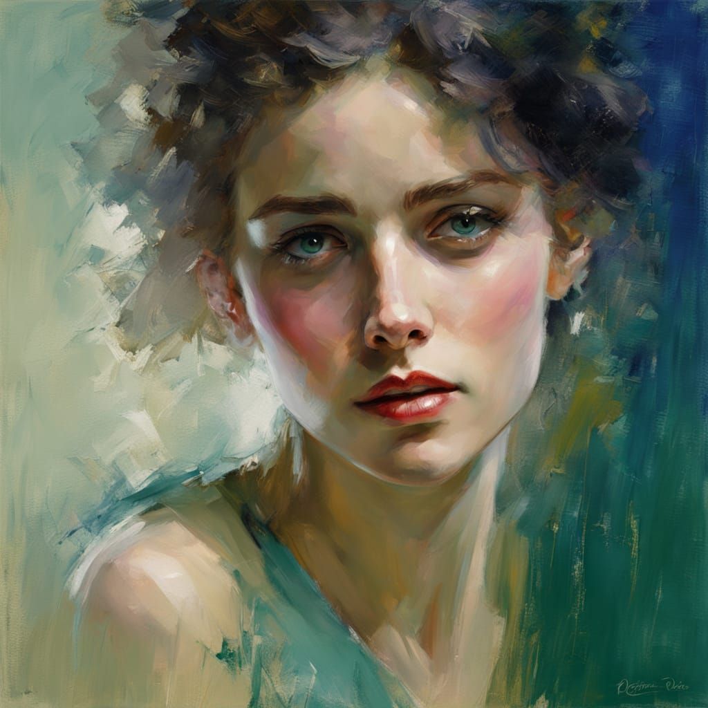 This oil painting features a woman's close-up portrait with a serene expression and deep gaze. Rendered with expressive, impasto brushstrokes and a rich texture, it captures a tranquil atmosphere.