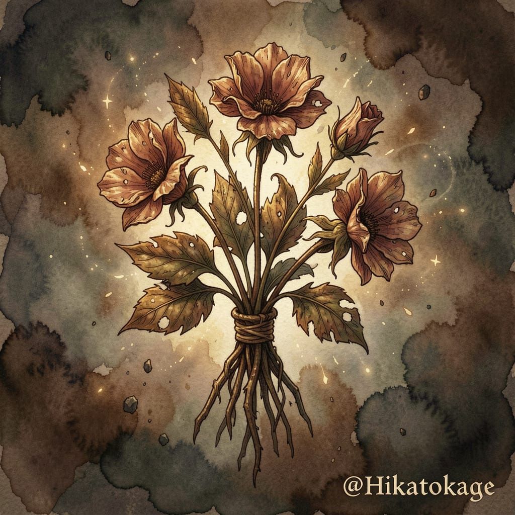 This image is a fantasy game icon depicting a withered bouquet of flowers. It is rendered in a watercolor illustration style with earthy tones and a magical glow, suggesting ancient decay.