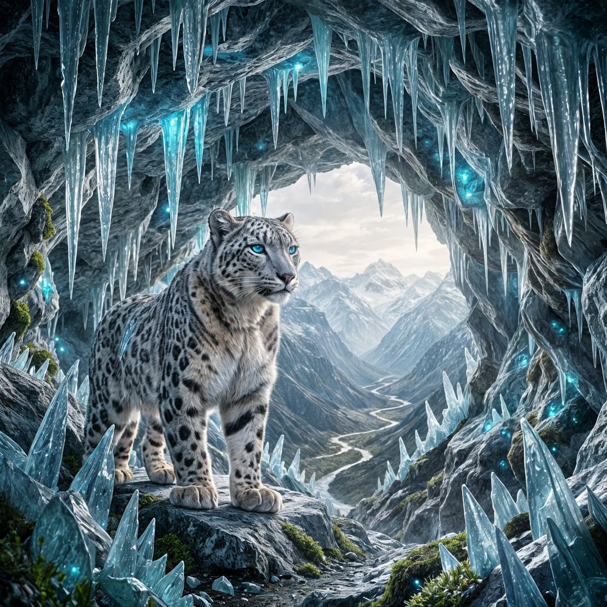 This image shows a majestic snow leopard in a hidden glacial cave. Shimmering ice and bioluminescent moss create an ethereal glow, rendered in a hyperrealistic style with dramatic lighting.
