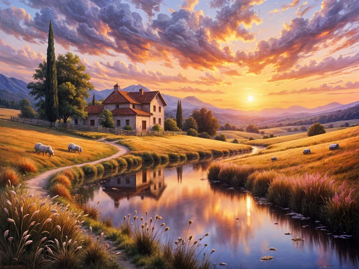 A painterly oil realism image of a European countryside at sunset. Features a vibrant, saturated horizon with reflections in a still pond, rolling hills, and a rustic farmhouse.