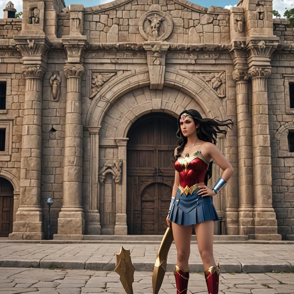 A digital 3D anime rendering of a woman in a Wonder Woman-themed outfit striking a pose at the Alamo. The image is highly detailed with an aesthetic, concept art style.
