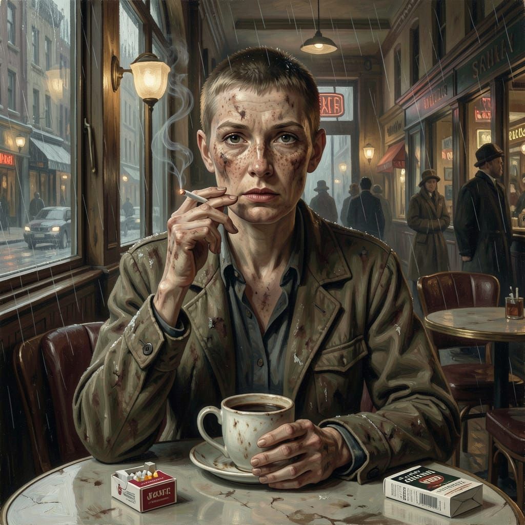 This image shows Ginger Rogers in a run-down 1930s cafe on a rainy Christmas, captured in the atmospheric style of an Edward Hopper oil painting, emphasizing emotional detachment.