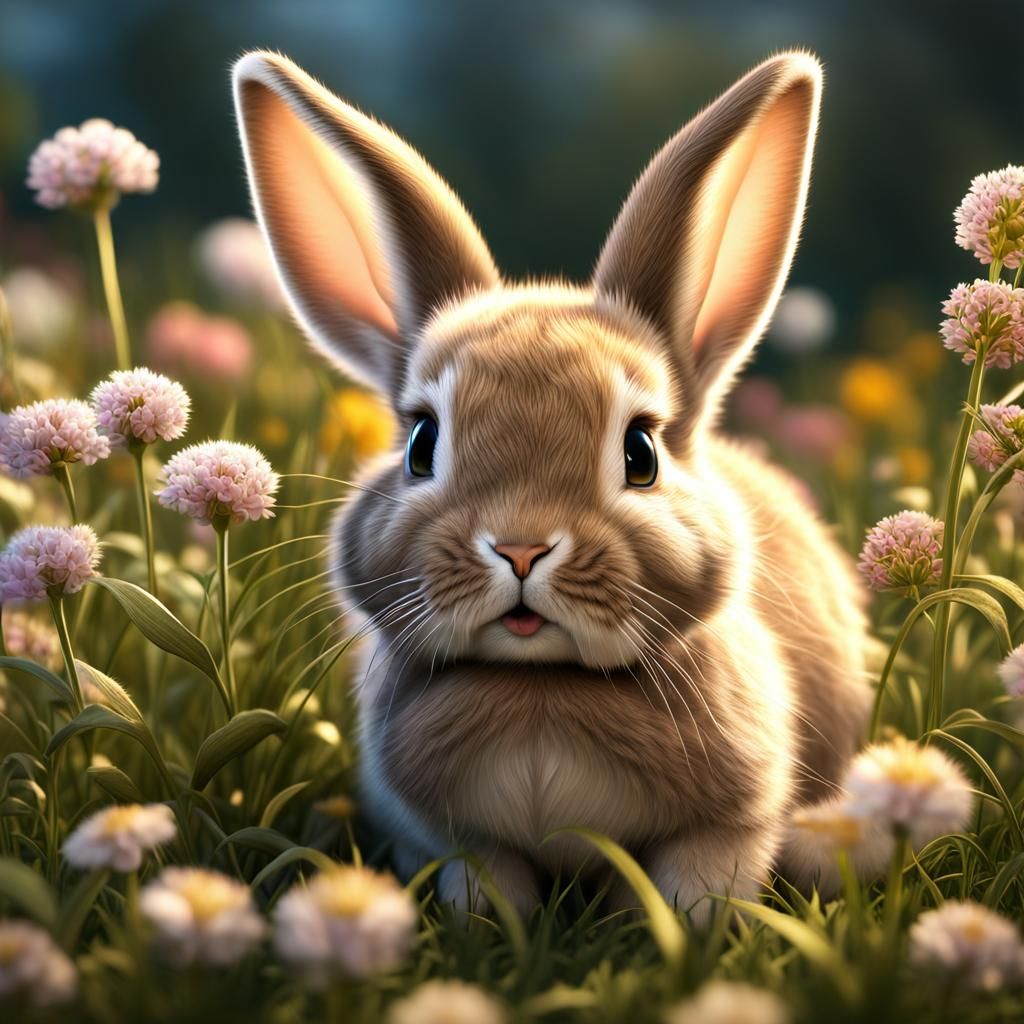 This image shows an adorable baby rabbit playing in a flower-filled field. The photorealistic CGI rendering features dramatic lighting, sparkling eyes and intricate details captured in sharp focus.