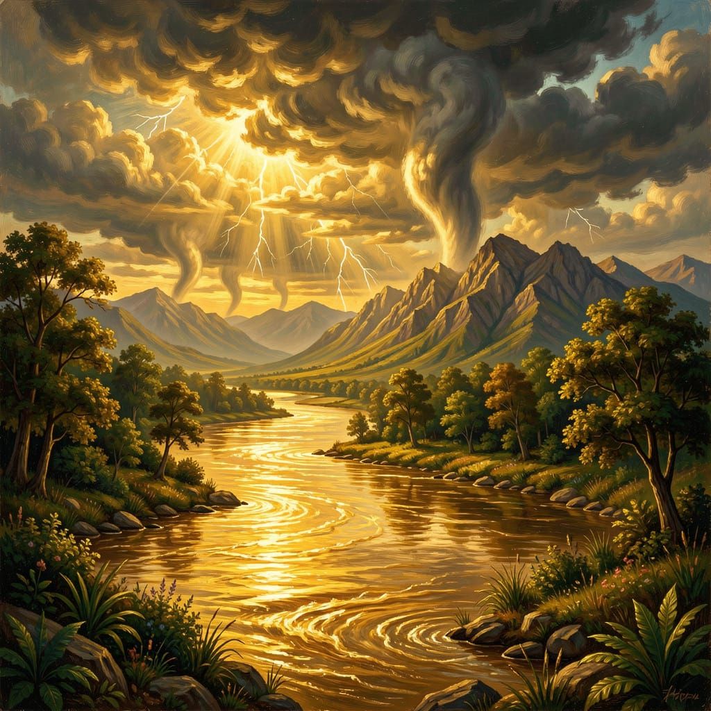 This image shows golden light rivers flowing through stormy skies with distant tornadoes. Epic digital painting style with dramatic lighting and vibrant colors.