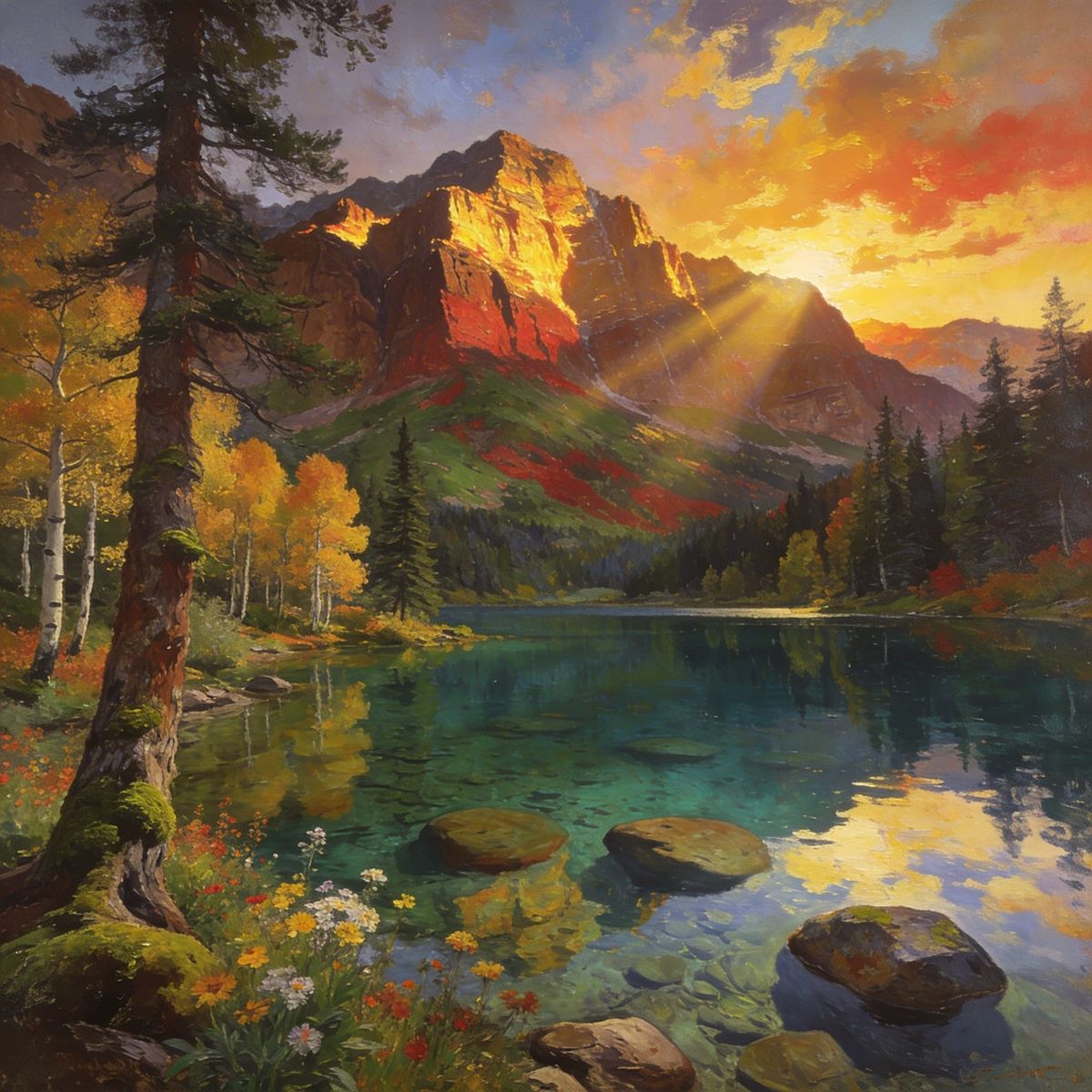 This image showcases a majestic mountain range at sunset, with golden light on peaks and a clear lake reflecting the sky. It features vibrant autumn trees and wildflowers, rendered with a textured oil painting style evoking vintage charm.