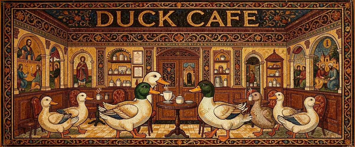 2/18/2026-mosaic byzantine Inside an elegant decorated coffee shop Duck serving coffee to other ducks mosaic byzantine At top rich in color in dark ri...Art By Archangel Tara