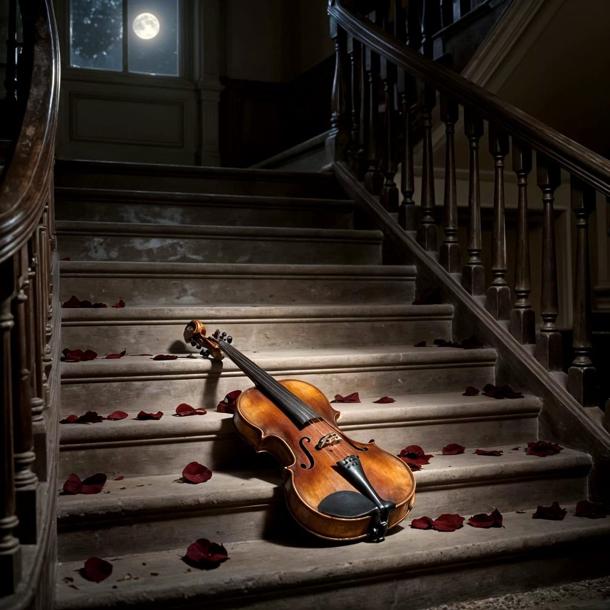 This image shows a weathered violin on a grand, dusty staircase in an empty Victorian manor, illuminated by moonlight. It evokes melancholic nostalgia and quiet grandeur in a vintage photograph style.