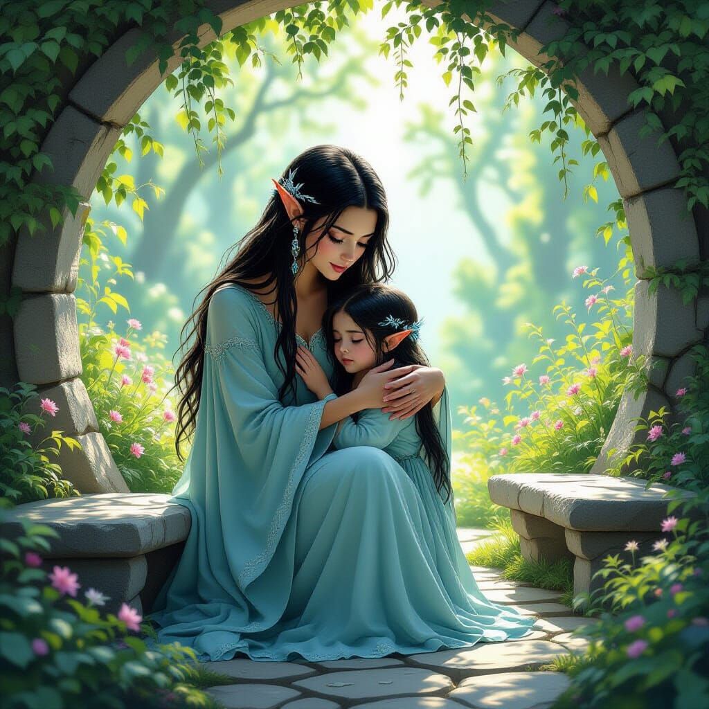 This image shows an Elven mother tenderly embracing her crying child within a sunlit faerie garden. Rendered in a luminous, ethereal digital painting style with soft, diffused light.