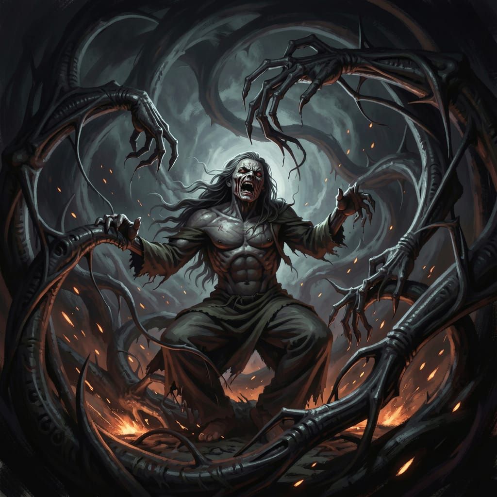 This image depicts a lone figure in agony amidst swirling dark energy and ethereal tendrils. Dramatic lighting highlights psychological horror in a dark, atmospheric digital painting style.