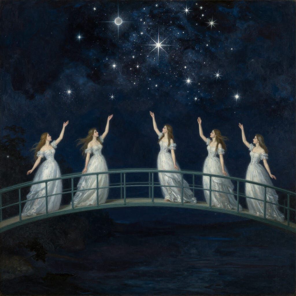 This painting depicts a midnight bridge scene filled with figures and exploding stars, evoking a sense of revelry and wonder.