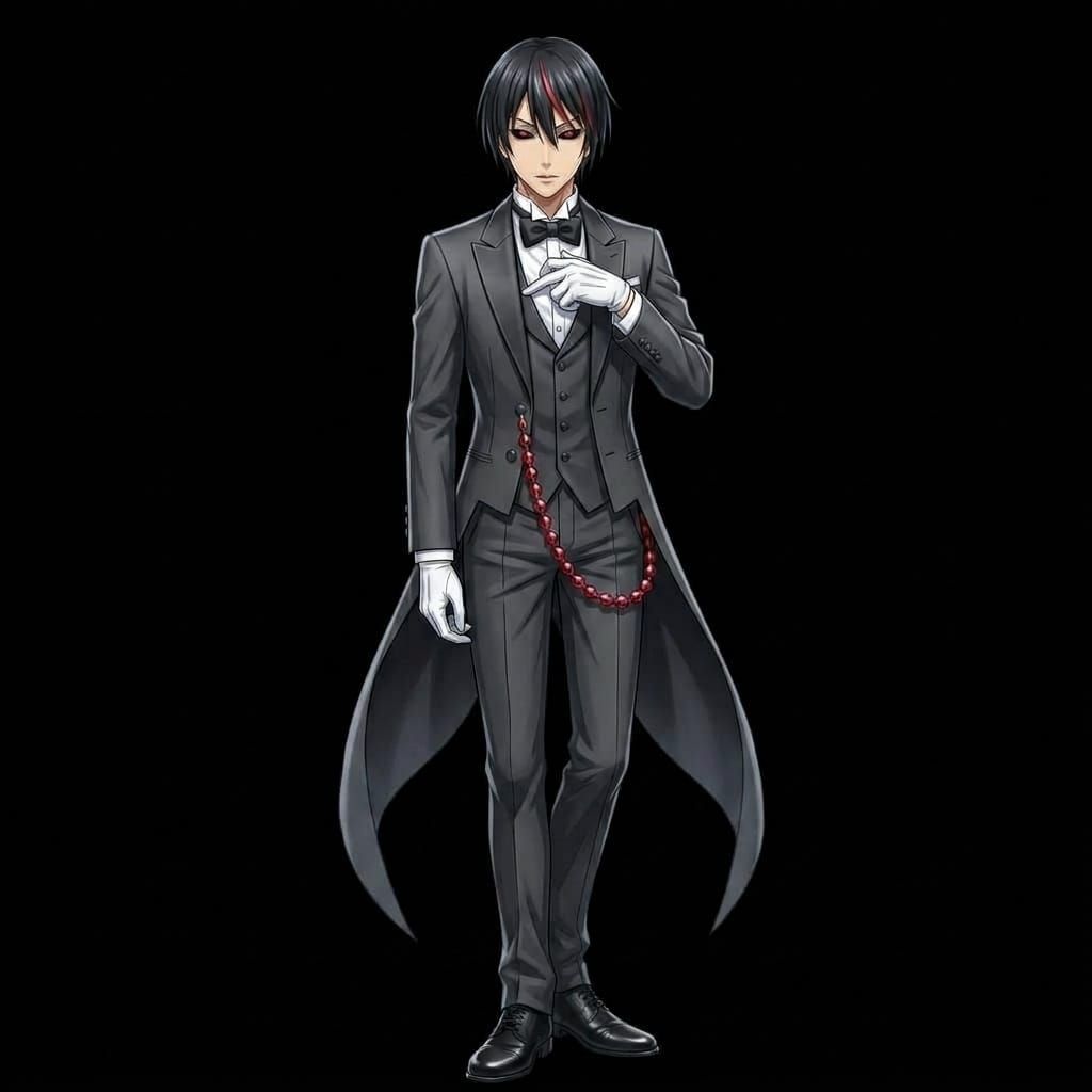 This striking portrait features a character with entirely black sclera, creating an intense and mysterious gaze. The dark aesthetic enhances the dramatic effect.