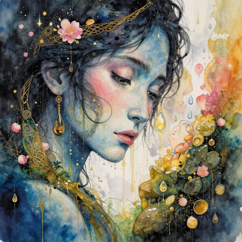 A poignant image of a colossal djinn embracing a tiny engineer amidst glistening water droplets and pink spring flowers. Ethereal watercolour and ink flow create a magical, warm ambience.