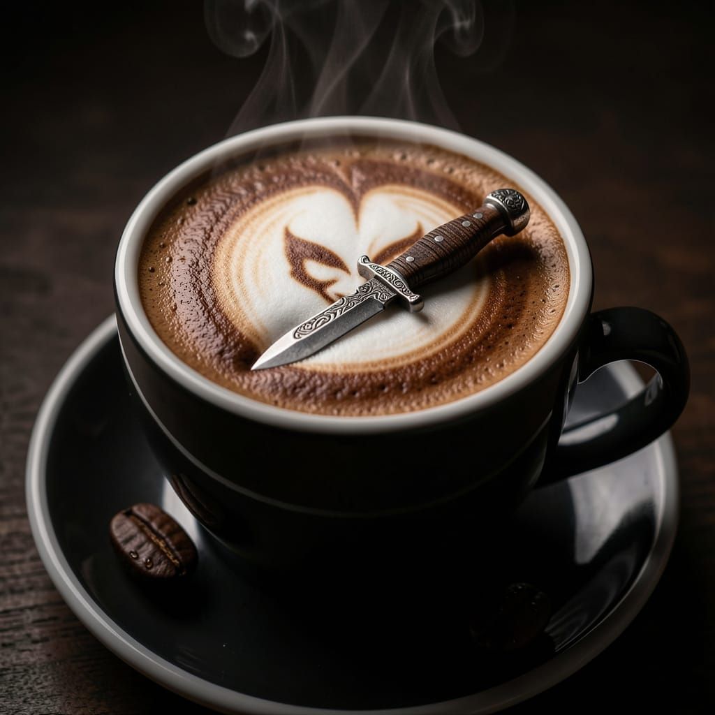 A photorealistic macro shot of a cappuccino with a tiny dagger on the foam. Dramatic lighting creates a sense of dark mystery and intrigue, evoking Italian espionage.