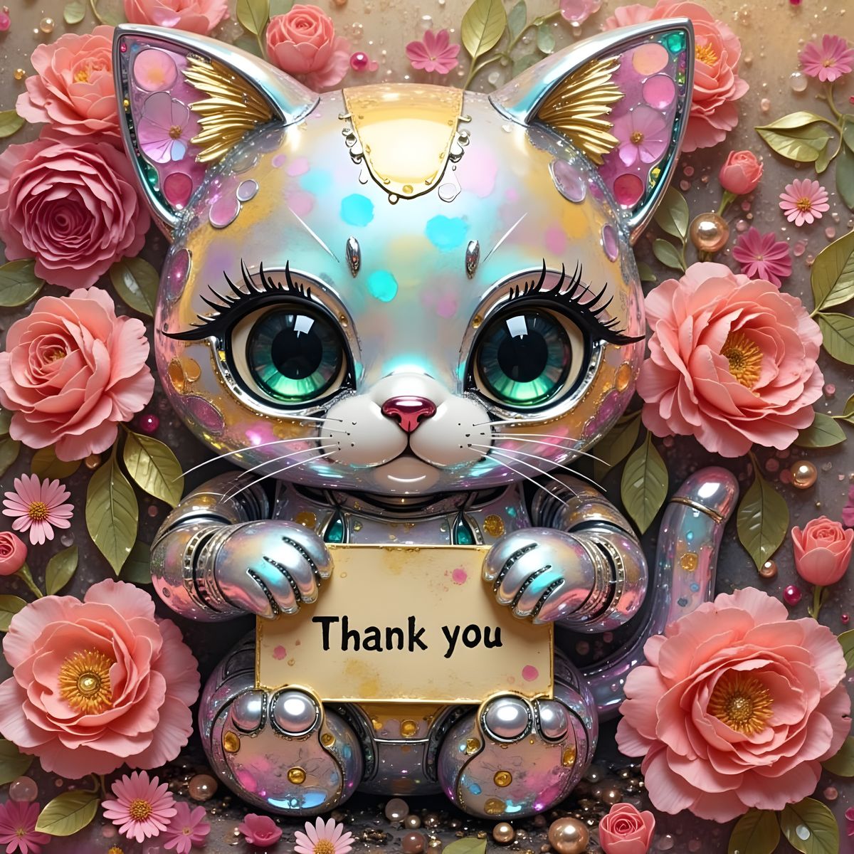 This image shows a tiny pearl cat robot amidst roses, holding a sign expressing thanks. It features a unique blend of floral, chrome, and robotic elements.