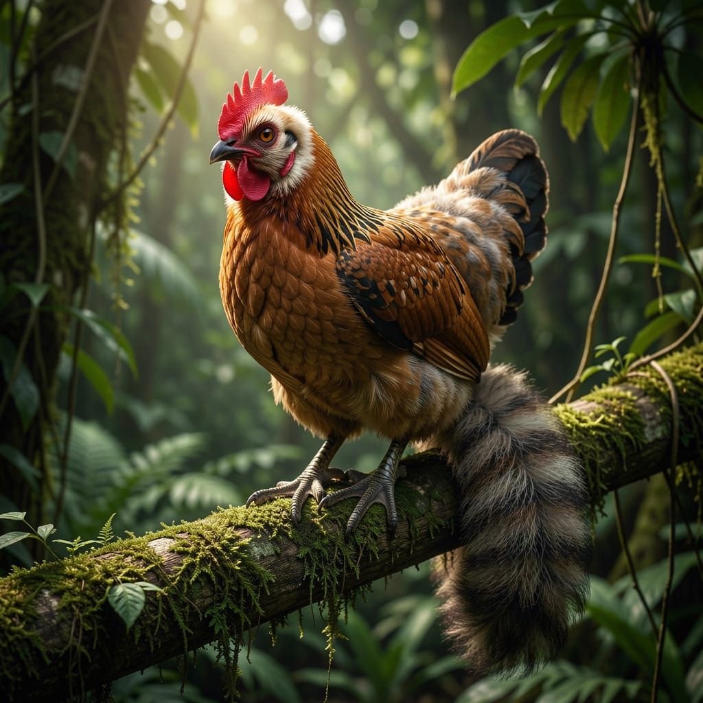 A striking image of a unique hybrid creature, a chicken with lemur features, perched on a mossy branch. Ultra-realistic detail and dramatic lighting enhance the jungle scene.