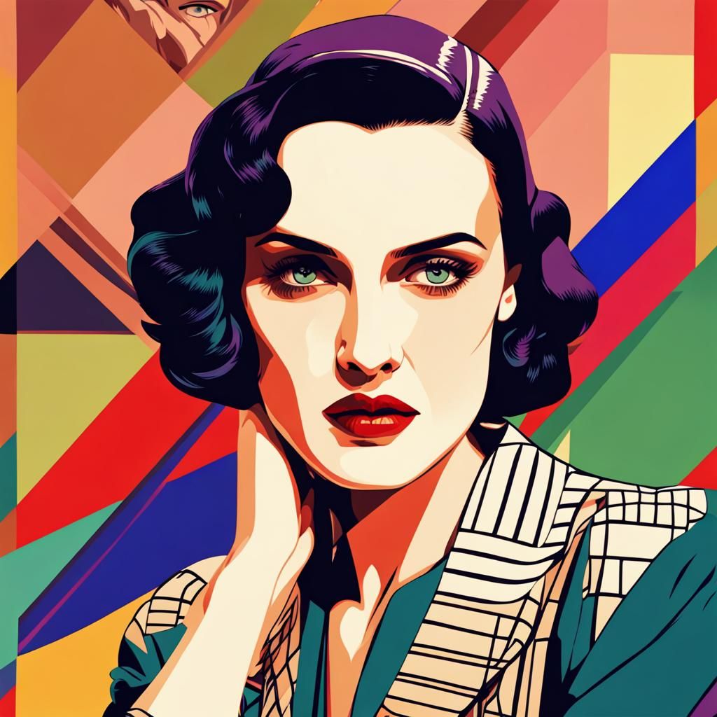 A digital pop art image of actress Katie McGrath in 1930s attire. The artwork features triadic colors, a symmetrical composition, and geometric Bauhaus influences.