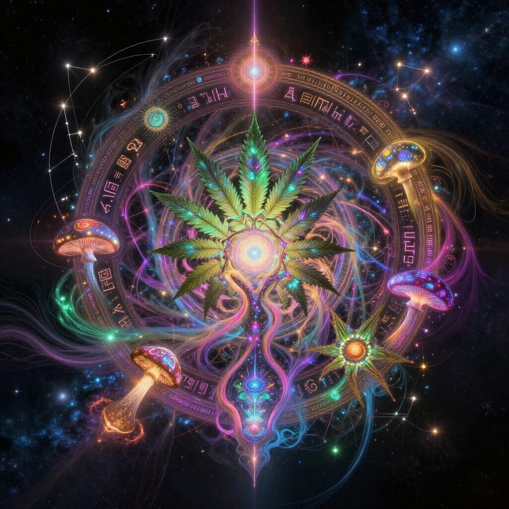 This visionary masterpiece depicts a hyper-detailed cosmic entity formed from fractal light and sacred geometry, surrounded by glowing flora and alien symbols in deep space. Rendered with volumetric lighting and infinite depth.