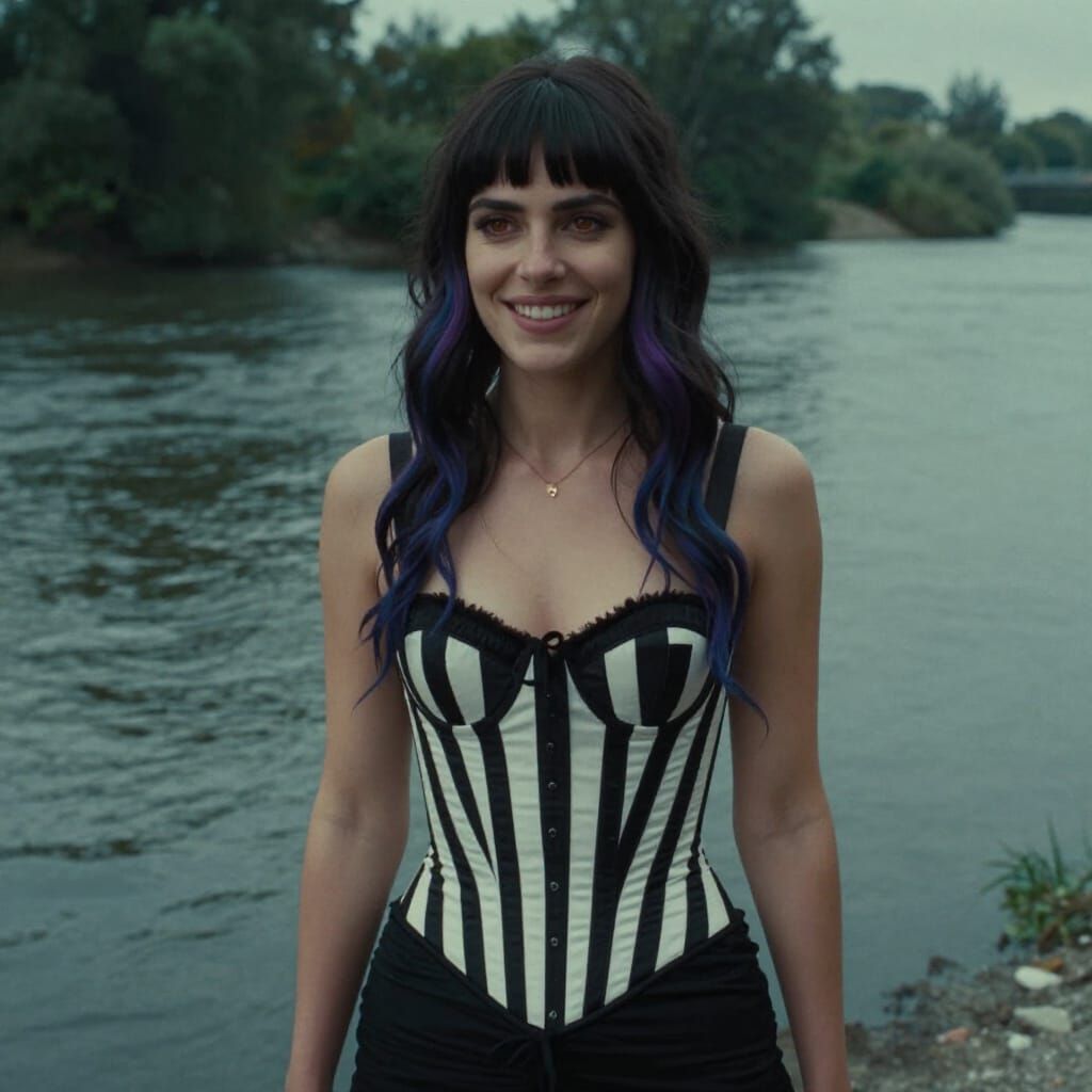 This image is a cinematic film still of a smiling woman with dark hair and copper eyes by a river. It features dramatic lighting and atmospheric film grain for a stunning, post-processed look.