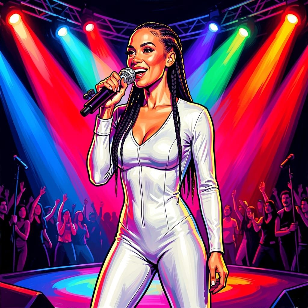 A pop singer performs on a brightly lit stage wearing a sleek white leather catsuit. The digital painting features vibrant spotlights and dramatic lighting, evoking a high-energy performance.
