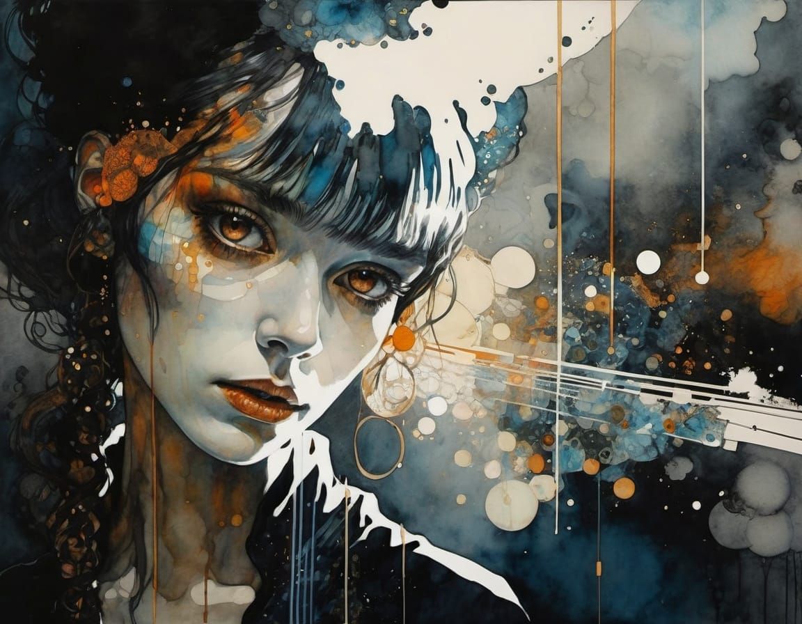 This image features a dark goth woman with brown eyes, rendered in an organic line drawing style with watercolor washes. The artwork evokes effervescent and incandescent qualities.