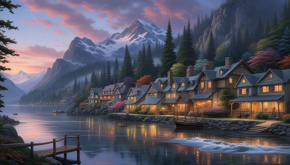 This image captures a serene landscape scene in the distinct, luminous style of Thomas Kinkade, known for his idyllic cottages and glowing light.