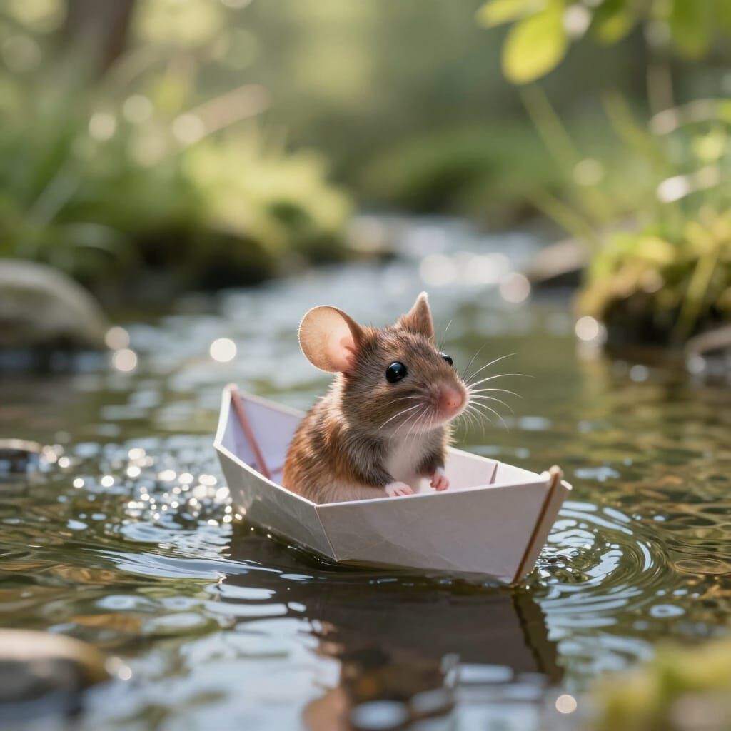 This image shows a tiny, adorable mouse in a miniature paper boat floating down a river. Sunlight glints off the water, creating a warm glow on the lush, green banks. Captured in a photorealistic style with macro lens and cinematic lighting.
