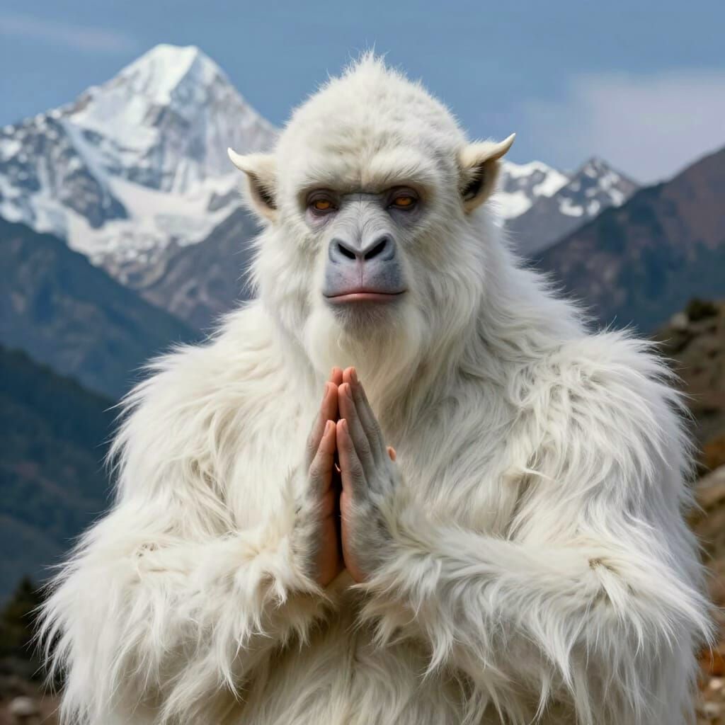 This hyperdetailed fantasy portrait shows a dignified white yeti in the Himalayas, hands together in a serene namaste gesture, inspired by Pre-Raphaelite and Baroque art styles.