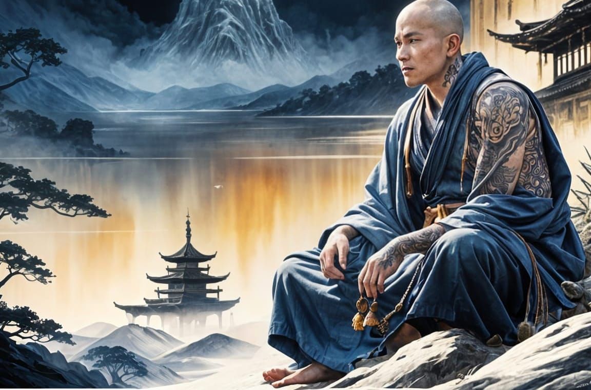 This image depicts a powerful warrior monk with intricate tattoos, showcasing a masterful blend of Eastern spirituality and martial arts