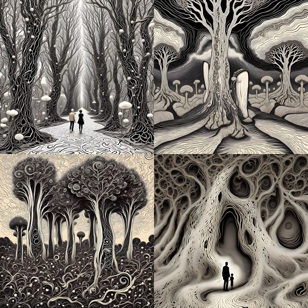This image showcases a surreal, photorealistic scene of a family standing near giant, angular postmodern sculptures and ancient tropical trees with intricate roots, rendered in black and white with detailed tracery.