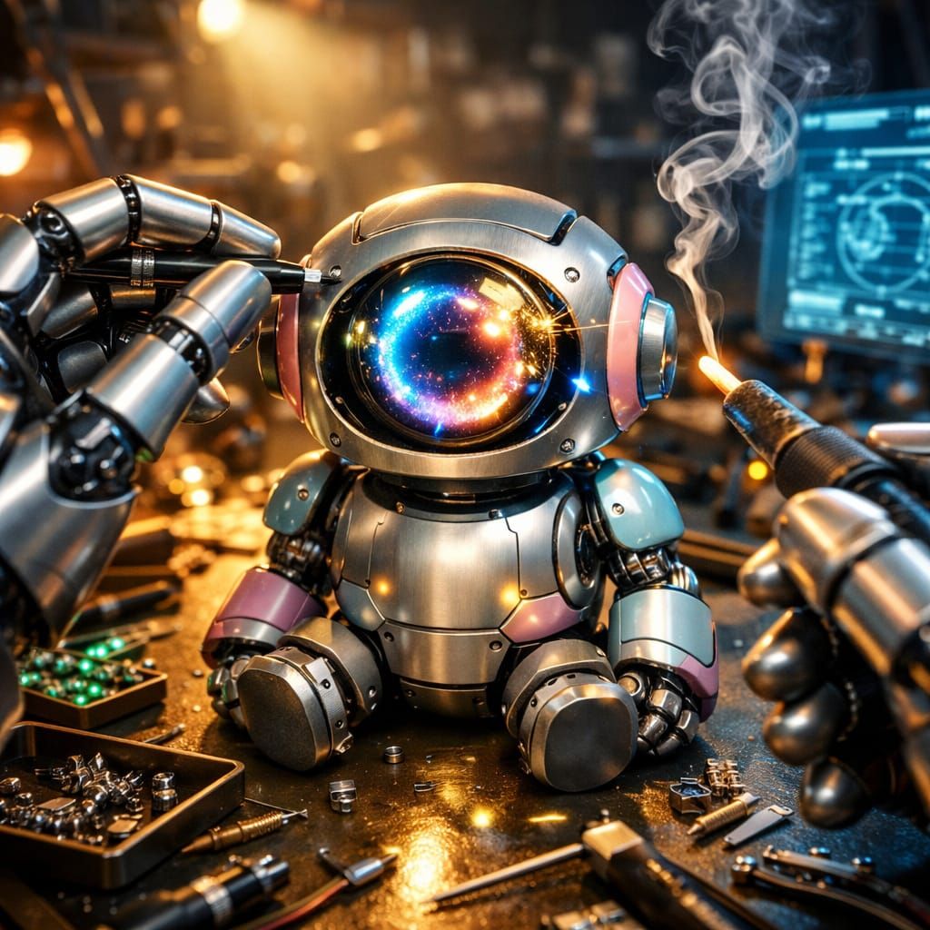 This image shows a first-person view of articulated mechanical hands assembling a cute, small robot with a glowing eye. Tools and schematics surround the workbench in cinematic lighting.