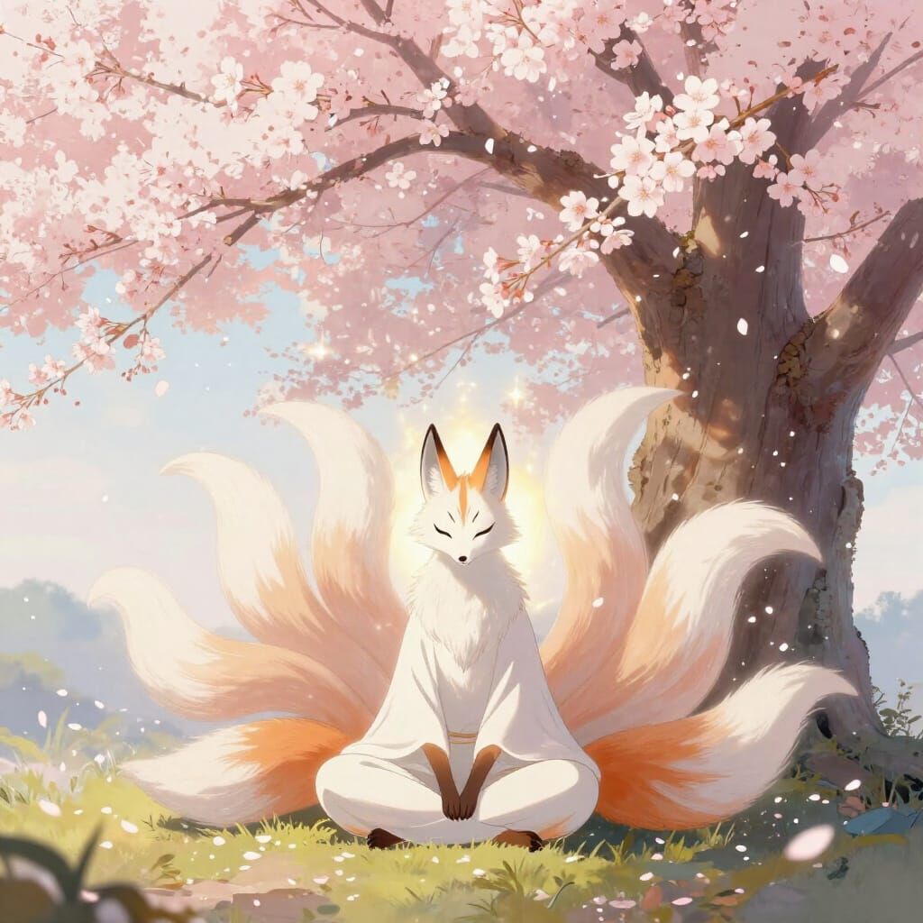 A wise, nine-tailed Kitsune meditates peacefully beneath a blooming cherry tree, with petals drifting. Rendered in a tranquil, painterly digital art style with soft pastel colors.
