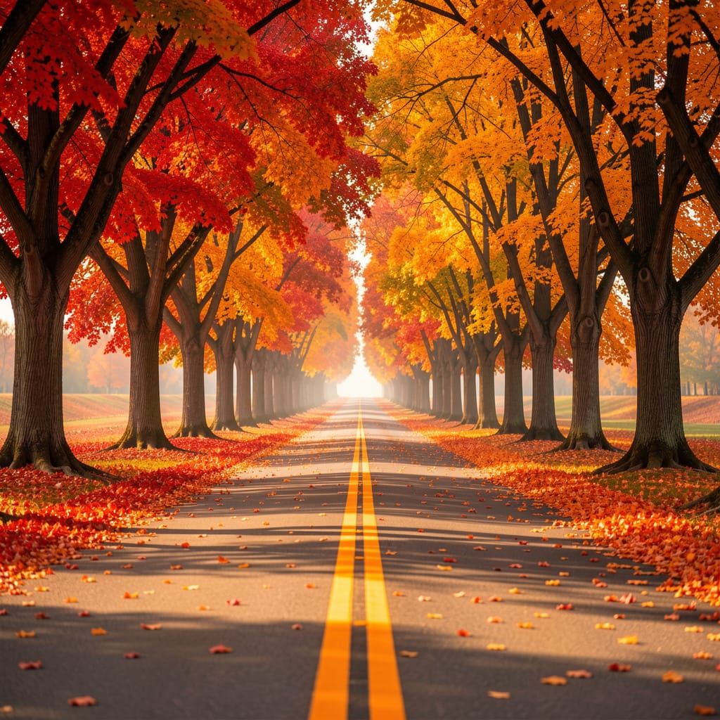 This image captures a long, straight road lined with mature trees in vibrant autumn colors. Fallen leaves create striking borders, reflecting the golden hour light in a hyperrealistic style.