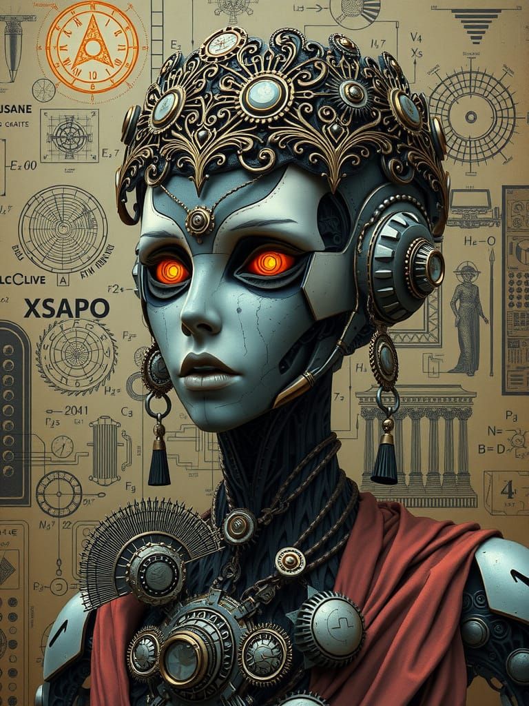 This image shows a powerful robotic high priestess with a distorted face, surrounded by a dark and chaotic backdrop of futuristic symbols and equations, evoking a sense of grimdark futurism and haunting horror.