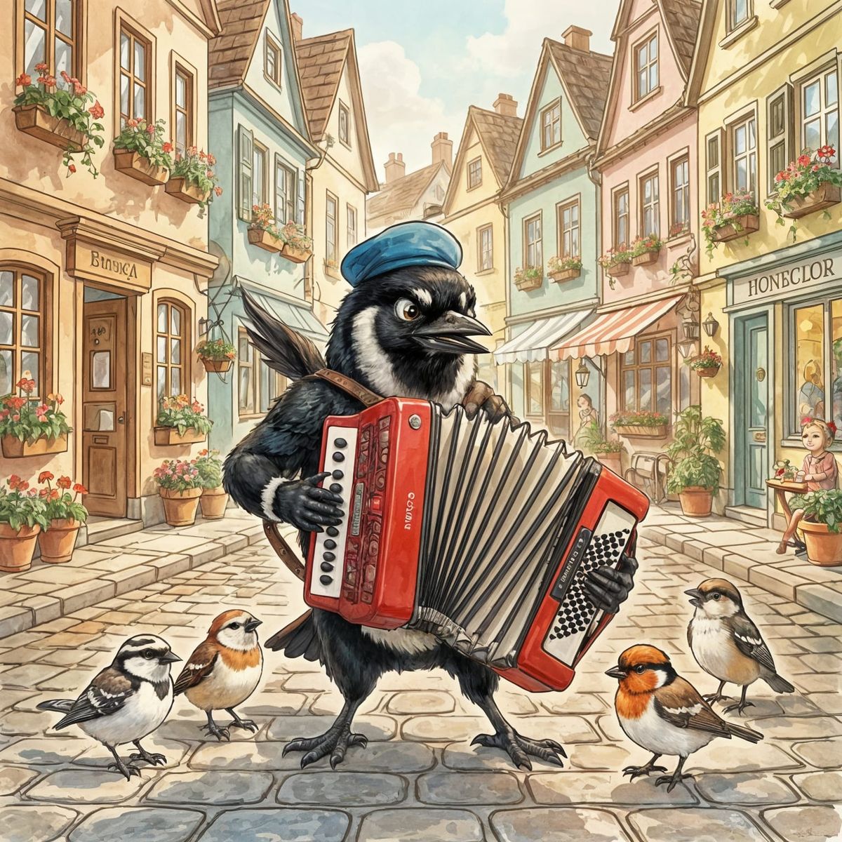 A mischievous magpie wearing a tiny beret, furiously playing a bright red accordion on a cobblestone street corner. A small ensemble of sparrows and robins provide backing vocals, chirping in harmony. The setting is a quaint European-inspired town square with colorful buildings and flower boxes. The ...