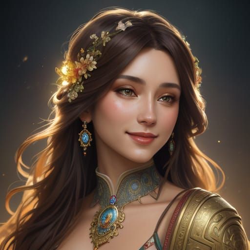This watercolor painting features a gorgeous, smiling woman with a stunning background. The portrait is highly detailed with dynamic lighting and vibrant colors.