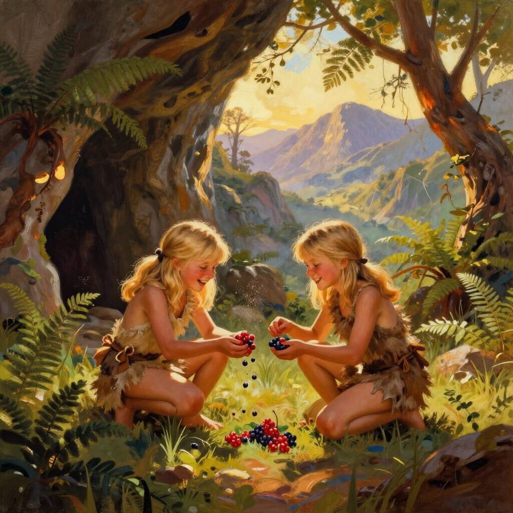 This image depicts two happy girls gathering berries in a lush, prehistoric setting with a cave. Sunlight illuminates the scene in a vibrant, painterly style emphasizing earthy tones and adventure.